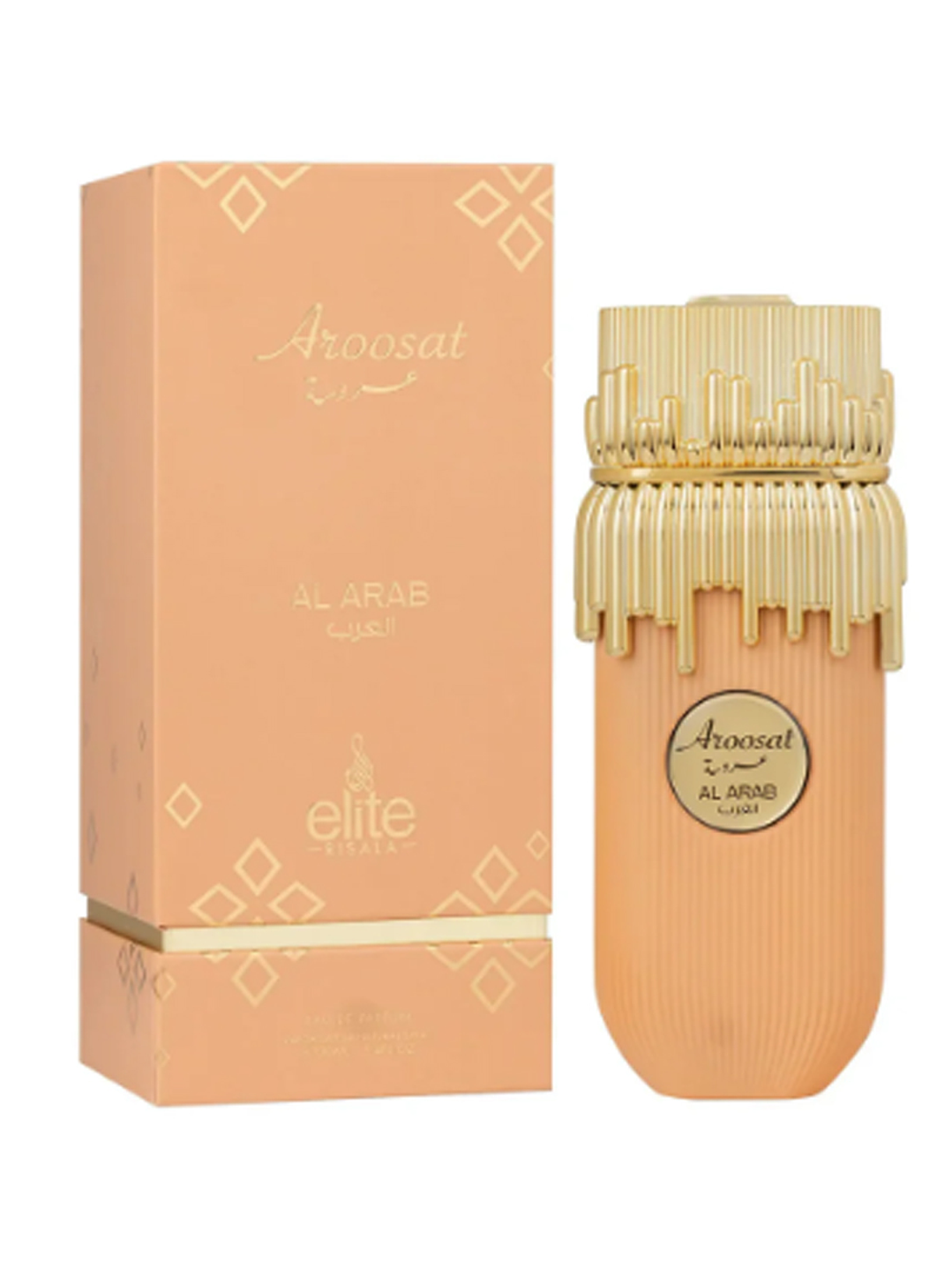 El frasco presenta un diseño moderno y estilizado, reflejando la sofisticación de la fragancia que contiene. - "Aroosat Al Arab de Risala Elite, perfume unisex gourmand con praliné, miel y caramelo. Dulce, envolvente y sofisticado, perfecto para cualquier ocasión."