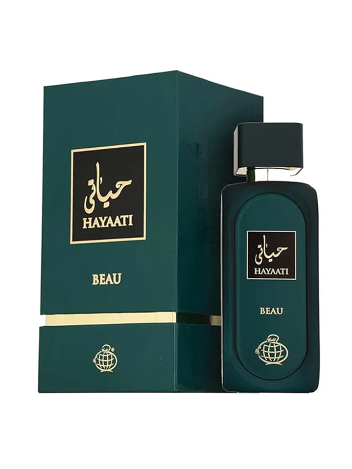 Hayaati Beau Fragrance World, perfume masculino árabe, fragancia fresca y amaderada, Eau de Parfum duradero, perfume inspirado en Le Beau, fragancia versátil para hombre.